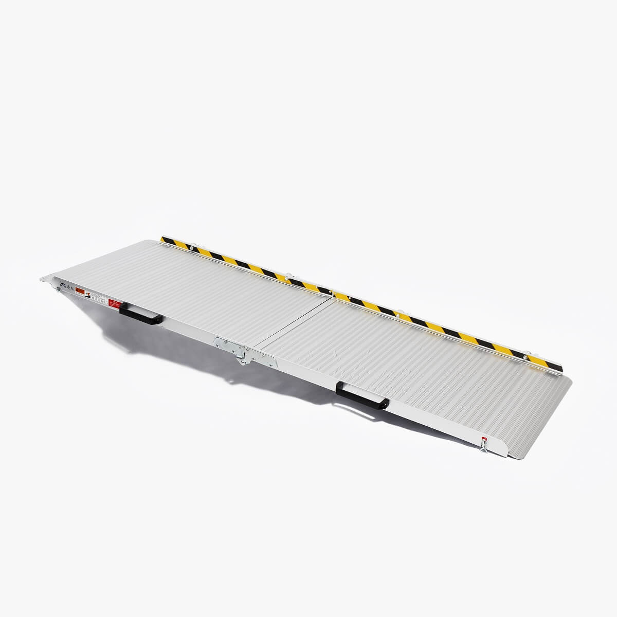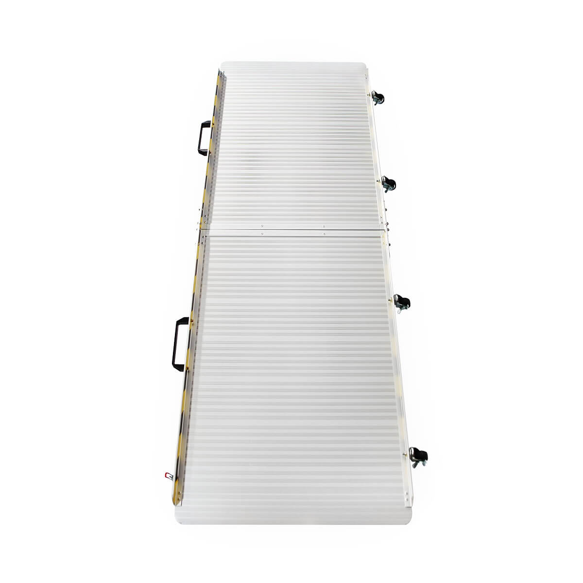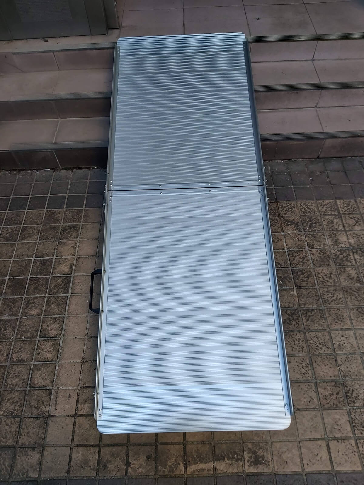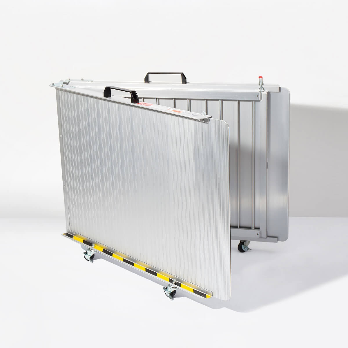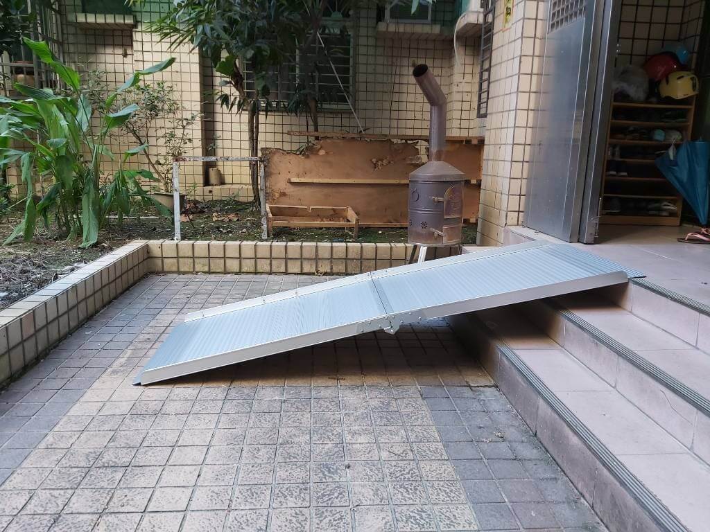 斜坡板寬度75公分,大型電動輪椅更好通過。有提把與輪子,收折後方便推行移動。